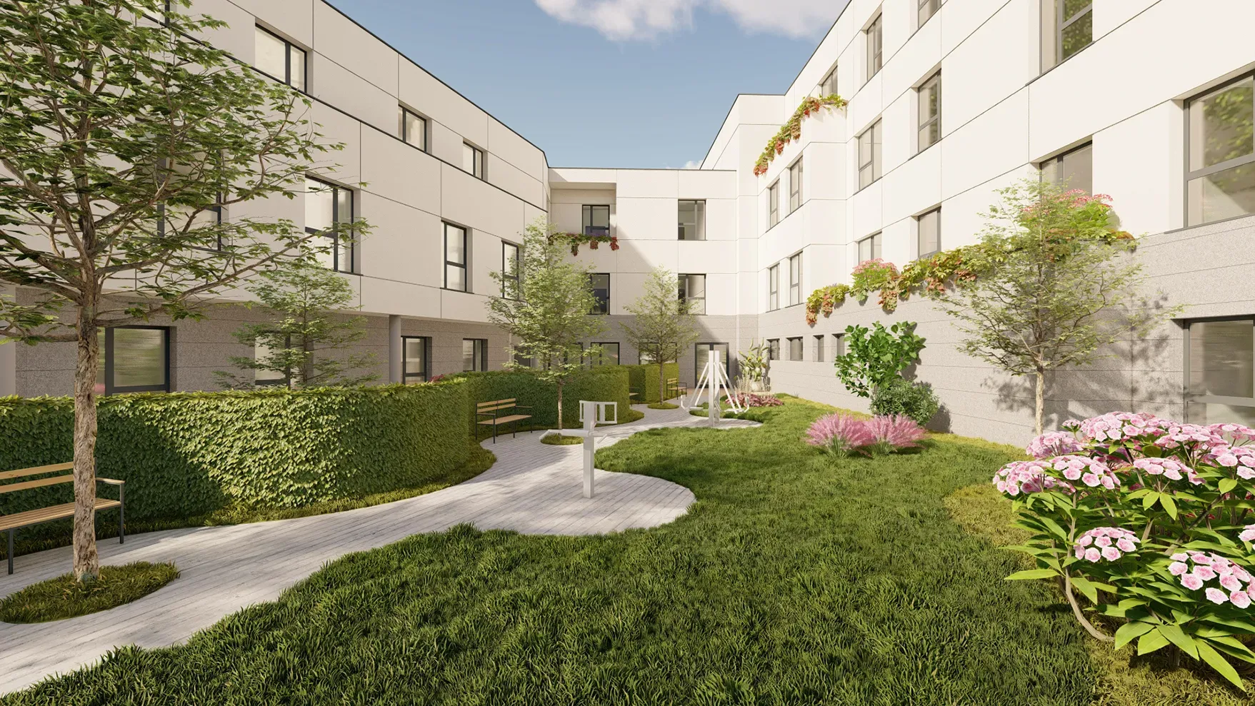 The project aims to create a central courtyard encompassed by the two main blocks, one of which is broken, housing the various living units.