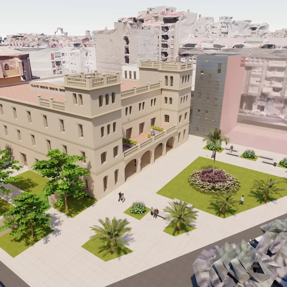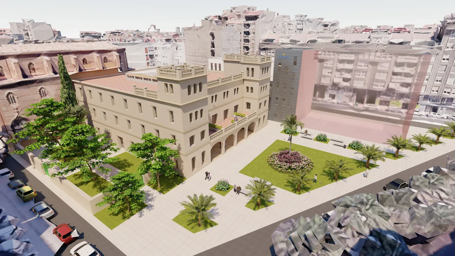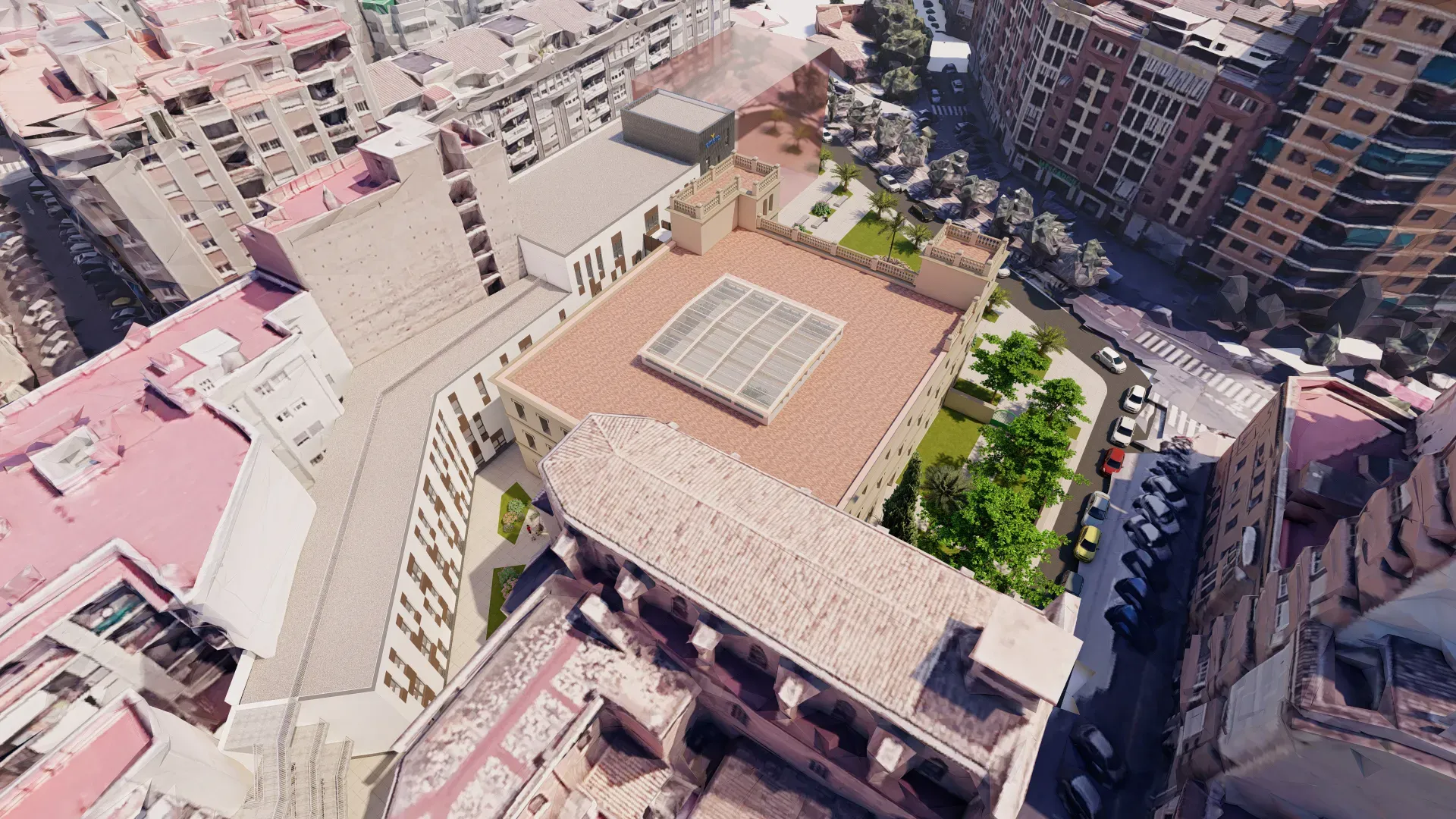 La edificación existente se ejecuta, según catastro, en 1889. Se trata de un edificio prácticamente aislado, sólo adosado en una pequeña parte de su perímetro, a la iglesia de la Parroquia de Nuestra Señora del Carmen. Aparecen otras pequeñas edificaciones en puntos de su contorno, que son objeto de derribo, según recoge el Plan Especial. El edificio existente se encuentra actualmente desocupado casi en su totalidad y parte de su estructura presenta mal estado de conservación, sobre todo los forjados, existiendo graves deficiencias estructurales (humedades, colapsos estructurales…) que hacen necesario el reemplazo de éstos prácticamente en su totalidad.