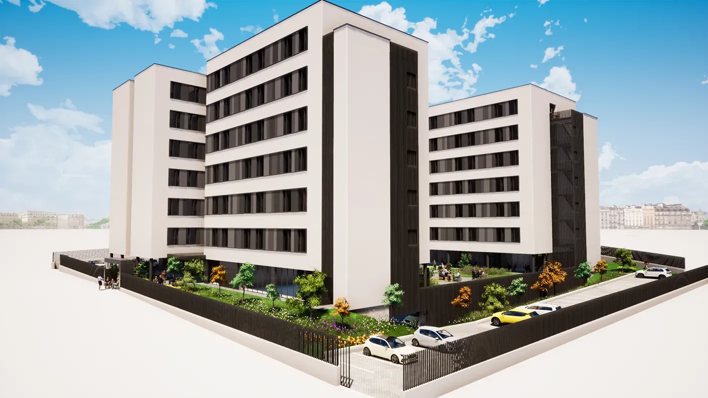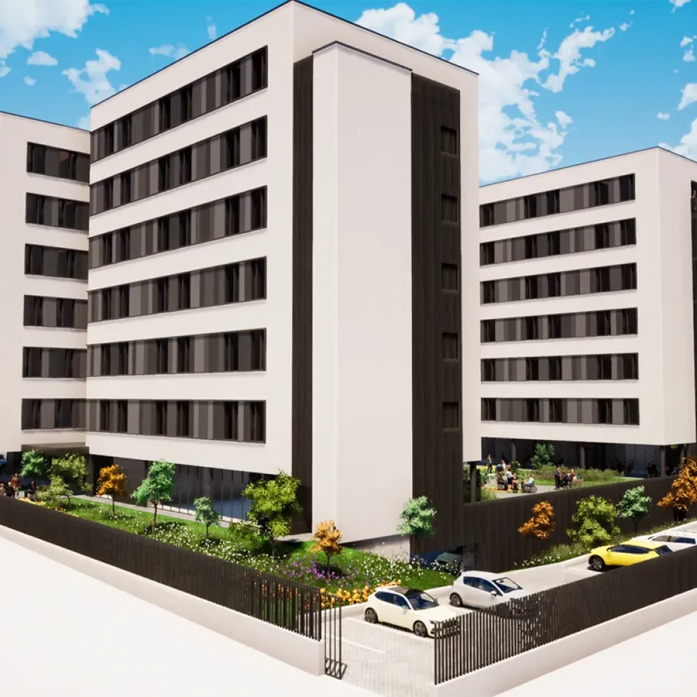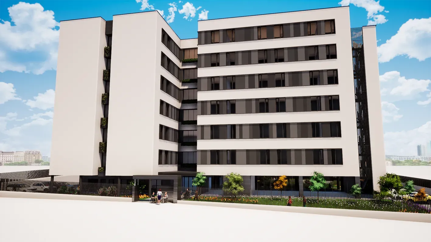 Se proyecta la construcción de 150 plazas de residencia en una edificación que se desarrolla en una planta bajo rasante (planta sótano) y ocho plantas sobre rasante (baja + 7).