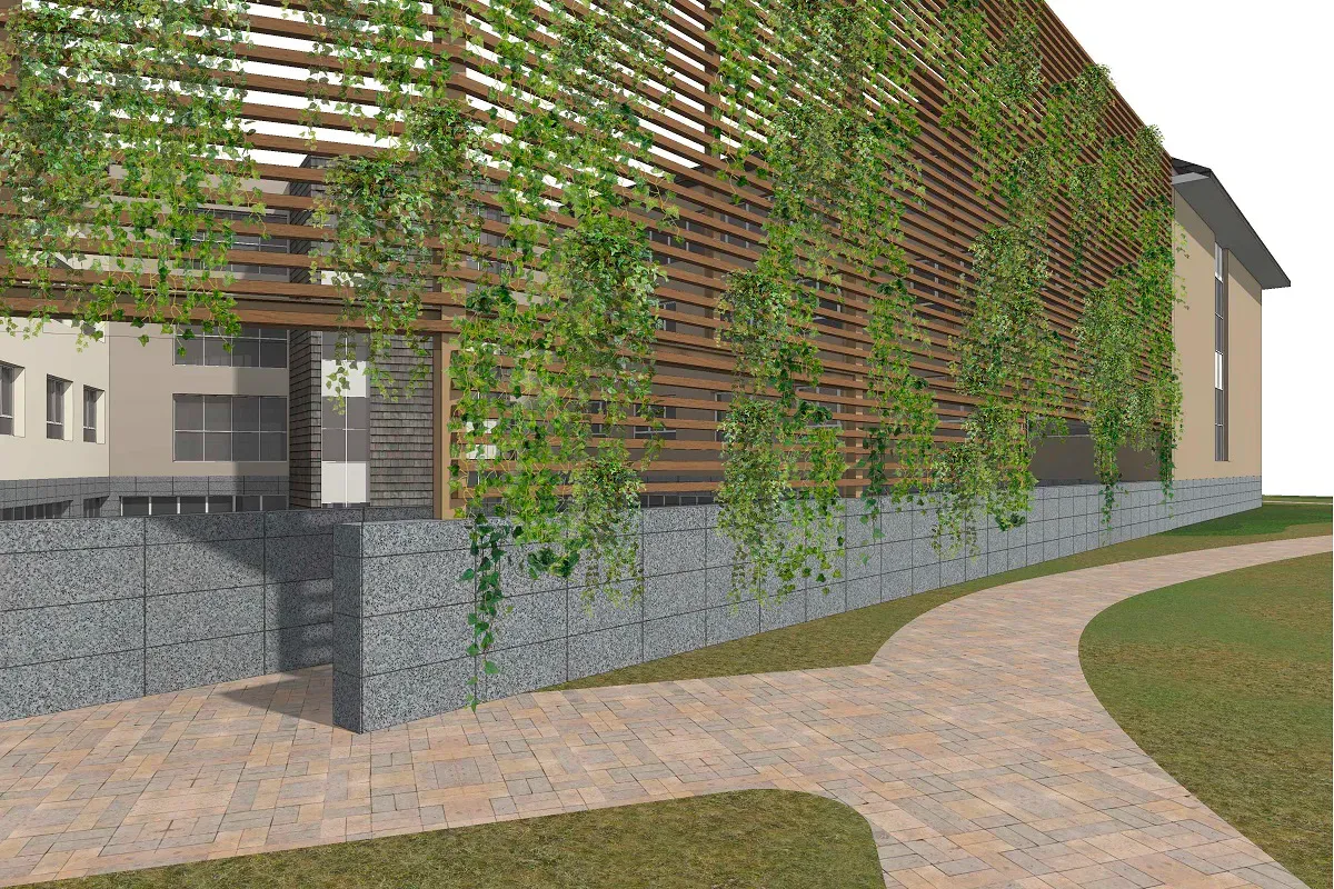 Se concibe como una edificación compacta que abraza a un gran patio interior tapizado de vegetación. La fachada se fragmenta y simula diferentes volúmenes, lo que se acentúa aún más por las distintas tonalidades elegidas según las directrices urbanísticas de Galicia. La elección de materiales y la configuración de los huecos, responden a la arquitectura tradicional de la zona.